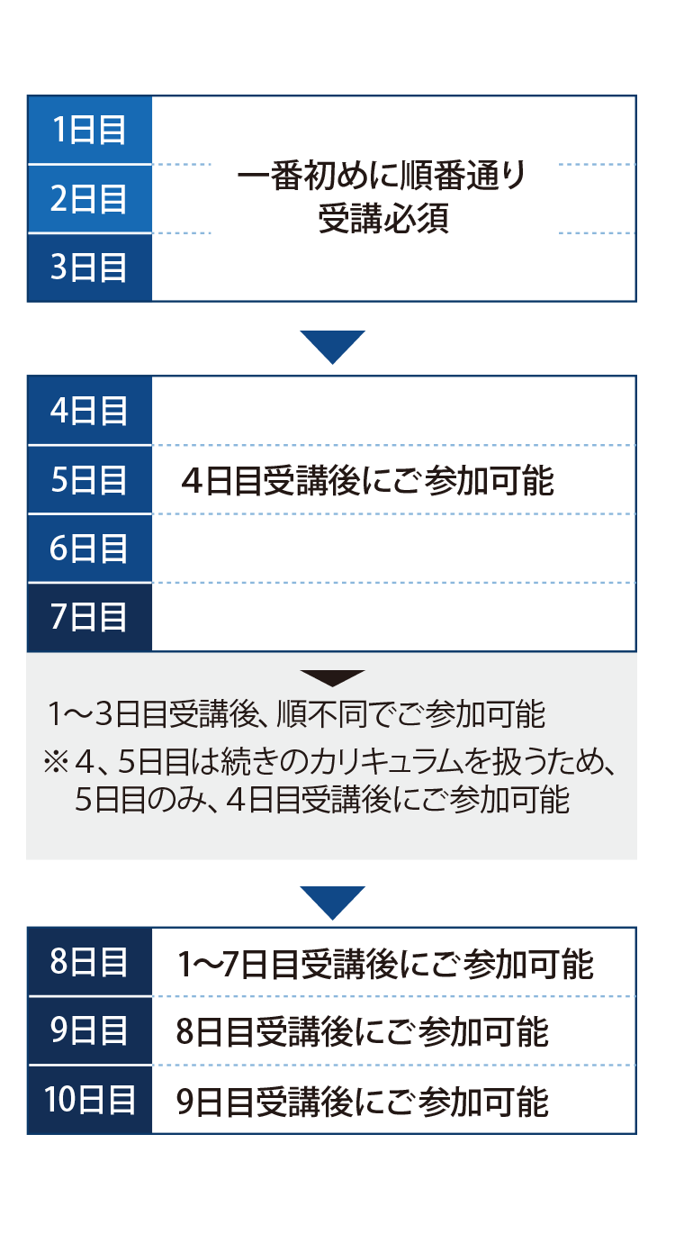 一番初めに順番通りのご参加が必須です。 - 1~3日目まで受講後、4、6、7日目は順不同でご参加が可能です。